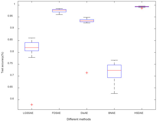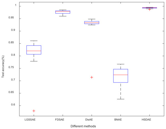 To further illustrate the stability of the proposed method, 20 experimental results of data set D are selected, and a box plot is drawn, as shown in Figure 10. Moreover, the smaller the length of the blue box, the smaller the data fluctuation. Therefore, the LGSSAE, DisAE and HSDAE methods are more stable. However, the red “+” in the figure indicates the abnormal value in the data. Thus, the LGSSAE method and the DisAE method occasionally lose their diagnostic level. In general, the proposed method shows the best stability among all methods.