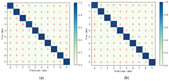 The confusion matrix can directly reflect the diagnosis results of the intelligent fault diagnosis method, so the confusion matrix is selected to analyze the HSDAE method further. It is the confusion matrix diagram of the 20th trial of the HSDAE method on data set A, as shown in Figure 11. It can be seen from the figure that, for the data of ten types of failures, the diagnostic accuracy of 99.27% can be achieved on the training set, and diagnostic accuracy of 99.1% can be achieved on the testing set. In the training set, categories 2, 4, 5, 6 and 9 all achieve 100% diagnostic accuracy, and the remaining categories have a small amount of misclassification. In the testing set, categories 1, 4, 6 and 9 achieved 100% diagnostic accuracy; except for categories 0 and 3, the number of misclassifications was very small. In conclusion, the diagnosis results show that the proposed method can achieve accurate fault diagnosis of rolling bearings.
