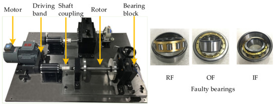 In order to verify the diagnostic capabilities of the network model proposed in this paper, four sets of rolling bearing data with different speeds from the same private test platform in the author’s laboratory are selected for verification testing. In this study, the signal with a sampling frequency of 25.6 kHz was selected as the test data. The test platform is shown in Figure 12.