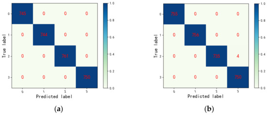 Similarly, a confusion matrix is used to analyze the fault diagnosis capability of the proposed method visually. Figure 16 is a confusion matrix diagram of the 20th trial of the HSDAE method on the data set H. It can be seen from the figure that for the four types of fault data, 100% diagnosis accuracy can be achieved on the training set and 99.87% diagnosis accuracy on the testing set. In the testing set, category 0, category 1 and category 3 achieve 100% accuracy, category 2 has four sets of data misclassification, and the recognition accuracy rate is 99.46%. In conclusion, the diagnosis results show that the proposed method can achieve accurate fault diagnosis of rolling bearings.