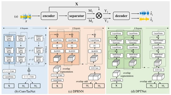 The structures of three networks, where (a) indicates the unified framework for source separation networks: encoder-separator-decoder, (b–d) indicate the separator in ConvTasNet [15], DPRNN [22], and DPTNet [23], respectively.