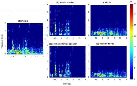 The spectrogram of (a) mixture, (b,c) two clear sources, (d,e) two estimated sources obtained by ConvTasNet with 32 samples, where two sources are from a female speaker and birds.