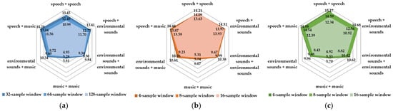 In addition to the average SI-SDRi in the entire dataset, the performances of three networks for mixtures with six different types are shown by spider charts with numerical labels in Figure 3. For the separation of speech and other sounds (speech and speech, speech and music, and speech and environmental sounds), the results of the three networks are all significantly better. It means that no matter what kind of network structure is adopted, they can separate sounds with clear structures such as speech. The limited separation between and within environmental sounds and music may be attributed to the following reasons: the music sound here refers to the music pieces rather than individual tones played by one instrument, consisting of a series of instrument tracks. If two music pieces with the same genre are mixed, it is difficult even for humans to separate them. Another reason is that the amount of conveyed information in environmental sounds may not be the same as that of speech, resulting in more difficulties in the separation.