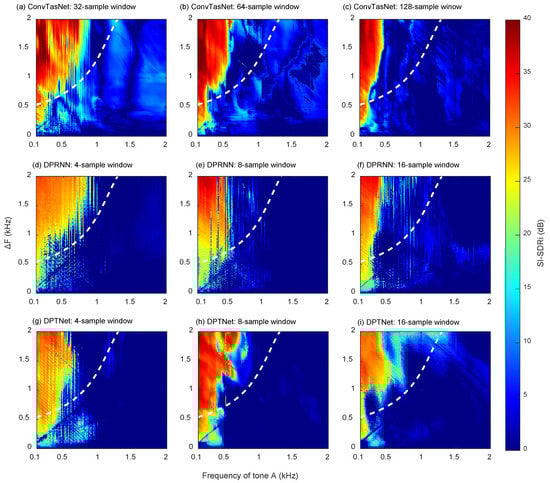 SI-SDRi (dB) as a function of the frequency of tone A (kHz) and ΔF (kHz), where (a–i) represent results of three well-trained networks (ConvTasNet, DPRNN, and DPTNet) with three different parameters, respectively. The dashed white curve is the ΔF separable threshold at each frequency in the human auditory system.