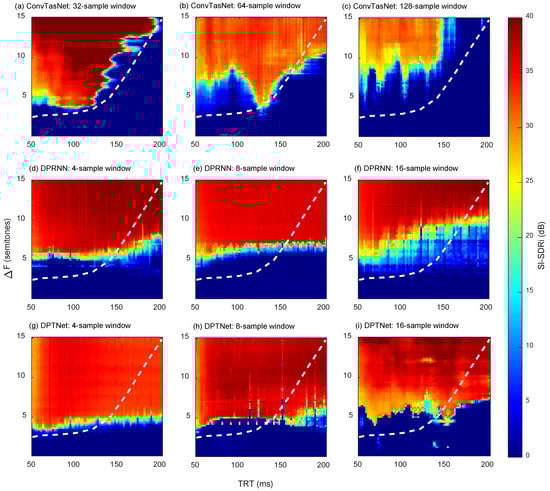 SI-SDRi (dB) as a function of TRT (ms) and ΔF (semitones), where (a–i) represent results of three well-trained networks (ConvTasNet, DPRNN, and DPTNet) with three different parameters, respectively. The dashed white curve indicates the temporal coherence boundary in the human auditory system.
