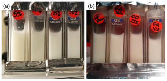 The deuterated milk samples. (a) Diluted milk powders in D2O solvent and (b) milk gels manufactured from diluted milk powders by acidification (marked “GA”) and rennet-induction (marked “GP”).
