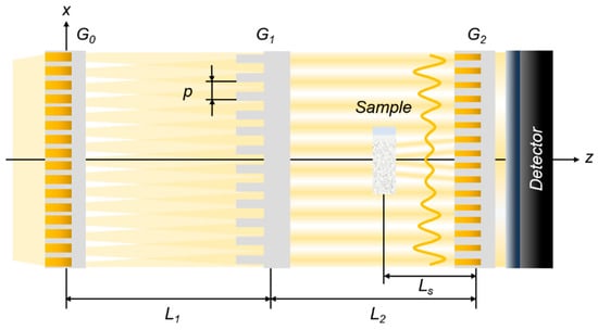 Figure 2 shows the principal set-up of a Talbot–Lau grating interferometer (TLI). The TLI consists of a source grating, G0, a phase grating, G1, and an analyzer grating, G2. G0 is an absorption grating that is positioned downstream of the source to generate multiple collimated beams, providing a partially coherent beam. G1 is a phase grating that generates an interference pattern, called a Talbot pattern, further downstream. G2 is another absorption grating that is positioned at a fractional Talbot distance and matches the period of the interference pattern. The geometry of G0 and G1 is such that the interference patterns of the individual coherent beams from G0 add constructively at G2. The imaging detector system is positioned directly after G2 and resolves the local interference pattern pixel-wise through the phase stepping of one of the gratings, typically G0.