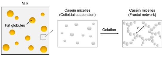 Schematic representation of the milk structure (fat globules and casein micelles) and the gelation process.