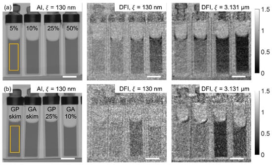 (a) Attenuation contrast image (AI) and dark-field images (DFI) of deuterated milk samples with different volume fractions of fat at probed correlation lengths of 130 nm and 3.131 μm; (b) Attenuation contrast image (AI) and dark-field images (DFI) of milk gel samples at probed correlation lengths of 130 nm and 3.131 μm; scale bar is 10 mm.