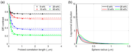 In order to analyze the detected local scattering, i.e., the dark-field contrast over the probed correlation length, the DFI curves were extracted for different regions of interest (ROI). These curves can be modelled and fitted according to Section 2.4. In Figure 5a, the plotted DFI contrast values are median values of ROIs consisting of 60 × 180 pixels as indicated exemplarily for two samples in Figure 4. Figure 5 displays the corresponding DFI curves of the deuterated milk samples. Initial visual inspection suggested the dominating structure sizes of up to approximately 1–2 μm by observing where the curves became flat, as tended to zero (compare Equation (2)). The increasing contrast, i.e., the deeper levels of flat tails, indicates increased total scattering cross sections, , due to increasing volume fractions of the dominating scatterers, i.e., FG. The dashed lines represent initial fits with a simple isolated monodisperse hard-sphere model [19,20,26], and Table 2 presents the fit results in terms of fitted parameters. It is observed that such fits, as expected, do not fully account for the measured slopes, which is especially the case where these turn from a steep decay to flat tails. The more extended bending region in the measured curves shows the influence of polydispersity. The solid lines, therefore, represent subsequent nonlinear least square fits with the polydisperse hard-sphere model, where the projected real-space correlation function is calculated by a numerical Hankel transform, according to Ref. [32] (Equation (3)), of the analytic expression of the scattered intensity according to Equations (5)–(12). The model thus accommodates the form factor (FG) of the spheres, i.e., the hard-sphere structure factor, for their high concentration and thus correlation, as well as their polydispersity. These fits result in good agreement with the measured data of the DFI contrast for different probed correlation lengths in the ROIs (Figure 5a) and result in the fitted structural parameters for the FGs as shown in Table 3. The goodness of fits of FGs in the deuterated milk for the mono- and polydisperse hard-sphere models were considered using R2 and the adjusted R2 evaluation. The polydisperse hard-sphere model improves the quality of fit, in terms of both (R2) and adjusted R2, compared to the monodisperse hard-sphere model, as shown in Table 3. Both reach values > 0.95. We also found that the use of a structure factor does not further improve these values, which might be expected due to the low actual fat volume fraction.