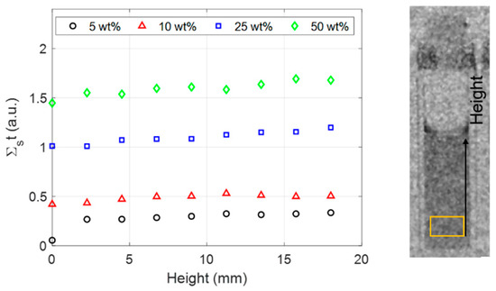 When considering the homogeneity of the samples by choosing several smaller ROIs from top to bottom for each sample, as this imaging technique enables, a subtle increase of total scattering from bottom to top was found. Figure 6 shows an evaluation of the total neutron scattering with an increment of approximately 2.5 mm from the bottom to the top of the samples. The corresponding ROIs are indicated in the exemplary image on the right-hand side of Figure 6. The total neutron scattering increases clearly, in particular for the samples with higher fat concentrations. This indicates the presence of larger volume fractions and/or larger sizes of FG towards the top, which is intuitive, considering the lower density of fat. The fits do not, however, provide a clear conclusion about increasing radii towards the top of the samples. It is, therefore, possible that FG concentrates at the top without coalescing, due to a persistent slight repulsion.