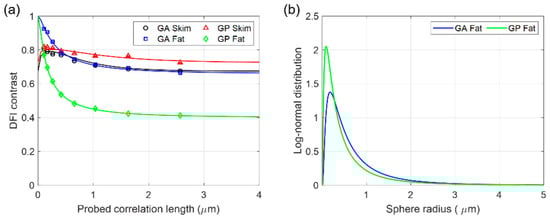 In particular, the FG provided a high nSLD contrast, as expected. This also manifested in a significant DFI contrast increase for samples of increasing fat content. The scattering of the FG can be modeled assuming hard spheres, a model applied regularly in quantitative DFI analyses [19,20]. However, it is known from the literature that the FG do not appear as being monodisperse, but rather as being polydisperse, a situation that has, in contrast, not been modelled in the context of DFI so far.
