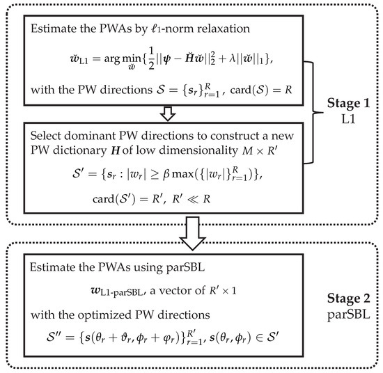 The second stage of the proposed method is summarized in Algorithm 1. Note that the solution in Stage 1 is only used to select the dominant directions, and is initially assigned to . The results include the estimated PWAs and directions, which are denoted as . Figure 2 shows a schematic illustration of the proposed method, L1-parSBL.