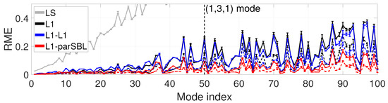 Figure 3 shows the RMEs corresponding to the first 100 modes for different methods, with and 1000. The methods evaluated were LS, -norm relaxation (L1), L1-L1, and the proposed L1-parSBL. L1-L1 denotes the method of selecting dominant PW directions based on L1 and re-estimating the PWAs based on the low-dimensional dictionary, according to L1. We observed that L1-parSBL outperformed the other methods, and even L1-parSBL with yielded better outcomes than the other methods with . All methods except LS provided comparable RMEs for low-order modes. LS exhibited very poor performance and could not provide an acceptable reconstruction for modes above the 22nd order (RME > 0.3). Although a maximum of eight PW directions exist, smaller eigenwavelengths relative to the enclosure size cause the mode shapes to become more complex and more sensitive to the basis mismatch for higher-order modes. Thus, the RMEs of the other methods were increased. L1-parSBL could reduce the basis mismatch and achieved a better RME because it optimized the PW directions in Stage 2. In addition, the RMEs of different higher-order modes were considerably different, corresponding to different mode shapes. Axial and tangential modes tended to be better reconstructed than oblique modes. For oblique modes, more sample data points were needed or samples needed to be arranged properly to capture sufficient spatial information.