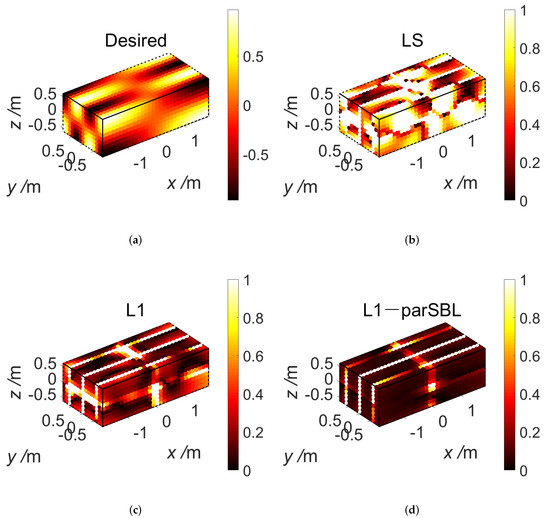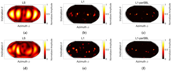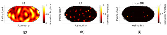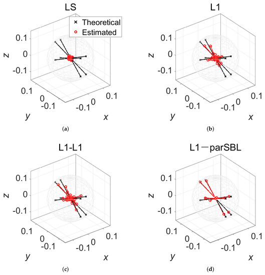 Specifically, we considered the high-order oblique mode (1, 3, 1) as an example to compare the approximation performance of these methods. Figure 4a shows the desired mode shape. Figure 4b–d plots the relative errors of the approximation at field points (), , for LS, L1, and L1-parSBL, which achieved RME values of 0.73, 0.26, and 0.09, respectively. The result of L1-L1 was similar to that of L1 and is not shown here. It was observed that L1-parSBL produced a better reconstruction of the mode shape. In Figure 5a–d, note that the numbers of estimated PWs for LS and L1, and , respectively, were both ; in contrast, for L1-L1, there existed only estimated PWs, , whose directions were selected in Stage 1. Moreover, L1-parSBL yielded estimated PWs, , whose directions were selected in Stage 1 and optimized in Stage 2. LS could not identify the actual PW directions because of which spatial aliasing artifacts were produced. The PWs could not be accurately estimated because of the basis mismatch, although L1 and L1-L1 could identify approximate directions. The proposed L1-parSBL efficiently optimized the PW directions to ensure that they were closer to the actual ones in Stage 2 and L1-parSBL estimated the PWAs more precisely than other methods. Similar results were obtained for the other modes as well. Thus, outcomes for only one mode are illustrated.