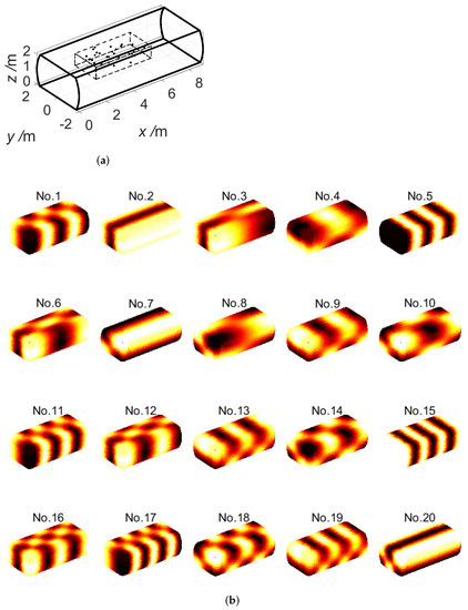 In this subsection, we considered a more realistic enclosure environment for an aircraft cabin, as shown in Figure 6a. The floor was set as a damping boundary with an absorption coefficient . In practice, we generally focus more on local regions. Therefore, a virtual parallelepiped of with the center at was defined as the sampling region. We used the Eigenfrequency study in the Pressure Acoustics, Frequency Domain physics interface in COMSOL Multiphysics for simulation. The vertices of the meshes inside the virtual parallelepiped region were chosen as the interpolated field points for assessment, and those outside the region were chosen as the extrapolated field points. We used 100 sets of samplings. Zero-mean, additive, Gaussian noise with an SNR of 25 dB was present during each sampling. We examined 20 modes around 107.5 Hz (the first-order blade-passing frequency) whose mode shapes are plotted in Figure 6b.