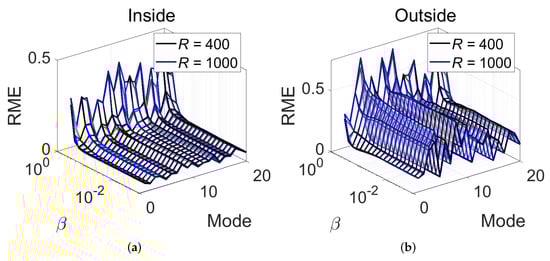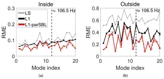 Figure 8 shows the RMEs of LS, L1, and L1-parSBL for the 20 modes inside and outside the virtual region, respectively, with and 1000. We observed that L1-parSBL achieved better RMEs than LS and L1 inside and outside the virtual region for the 20 modes. The RMEs of LS were all greater than 0.5, and L1 could obtain RMEs below 0.3 under four modes for the extrapolated field points outside the region. In contrast, L1-parSBL achieved acceptable reconstruction errors (RME < 0.3) for 13 modes. We also found that the denser discretized PW directions hardly improved the RME in this case. Additionally, the RMEs of different modes were very different, especially for the extrapolated field points outside the virtual region. This was because samplings were distributed in the local region and these samplings could not obtain sufficient spatial information for some modes. For example, for modes “No. 3” and “No. 8” of Figure 6b, the virtual region mainly included their nodal planes, so it was difficult for the samplings to capture the effective information of the mode shapes. Therefore, the estimated PWs lead to poor reconstruction accuracy outside the virtual region.