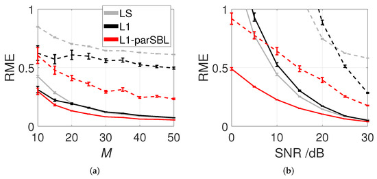 (Color online) RME of LS, L1, and L1-parSBL (—: Inside; - -: Outside ) (a) versus M (the number of samplings) with SNR = 25 dB, and (b) versus SNR with for the mode at approximately 106.5 Hz with .