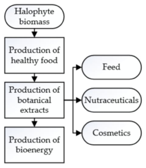 Vegetables and fruits are typically rich in health-beneficial bioactive compounds, such as phenolics and carotenoids [7,8]. However, these compounds can also be found in high concentrations in botanical extracts obtained from some agricultural and food processing waste, as mentioned in the review by Rauf et al. [7]. Halophytes are likely to produce high levels of these protective compounds due to their adaptation to extreme environmental conditions [9,10]. Besides healthy food, these plants could provide a novel feedstock for bio-functional feed, nutraceuticals, and the pharmaceutical industry [2,11,12,13]. For example, Lopes et al. [3] studied halophytes from saline habitats of southern Portugal and suggested various species that can potentially be utilised in cosmetic ingredients. These valuable bioactive compounds can also serve as value-added products that can be obtained from a halophyte-based biorefinery. For some succulent halophytes, such as Salicornia species, the food production period is relatively short, as the shrubs become more woody as they mature, making them unpleasant to eat. Due to high salt concentrations accumulated in the plant tissues, halophytes can be directly used as animal feed only when blended with other feed sources [14,15]. Therefore, these partly lignified plants are often considered agricultural waste. However, they could be used to extract phytochemicals as a part of a multi-product biorefinery. This concept is visualised in Figure 1. This would provide a value-added product stream for a biorefinery, whereasresidual extractive-free fibres could be utilised in bioenergy production, or in the production of other lignocellulose-derived products, such as bulk chemicals. Halophyte biomass has previously been tested for bioethanol and biogas production [16,17,18]. Production of botanical extracts can also be beneficial considering the pretreatment of lignocellulosic fibres, as it makes the fibres less recalcitrant, and lowers the severity of the pretreatment conditions that are needed [16,19]. Extraction with water would also remove salts which could otherwise cause issues during the processing [20]. In terms of other major compounds, since halophytes have exhibited interesting nutritional profiles [21,22,23], protein production has also been studied [24,25]. Despite their potential, halophytes are still underutilised both in agricultural and industrial applications [3,12,23].