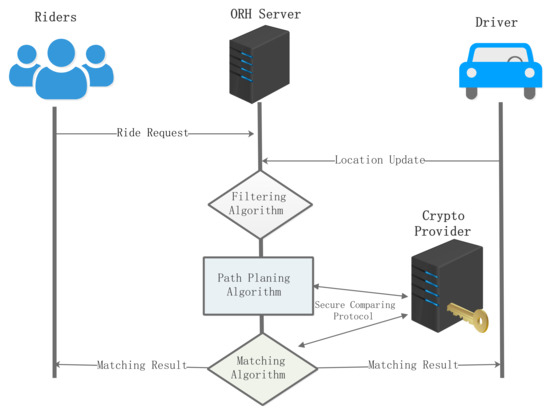 - Pham, A.; Dacosta, I.; Endignoux, G.; Pastoriza, J.R.T.; Huguenin, K.; Hubaux, J.P. ORide: A Privacy-Preserving yet Accountable Ride-Hailing Service. In Proceedings of the 26th USENIX Security Symposium (USENIX Security 17), Vancouver, BC, Canada, 16–18 August 2017; USENIX Association: Vancouver, BC, USA, 2017; pp. 1235–1252. [Google Scholar]