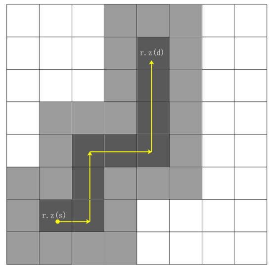 - Riders Filtering. To mitigate the computation overhead, the RS needs to filter the riders on their coarse locations of start point and destination point (i.e., the corresponding zones) as Algorithm 1.On receiving from a driver’s status D, the RS first checks if there are any existing riders. If , the RS searches the surrounding riders of within a fixed-size region and outputs the set . For each rider r of , the RS obtains the shortest route between and from precomputed data. Then the RS gets , which represents the zones sequence the route passes through. The RS selects M riders with the longest length of from as the root riders, meanwhile M corresponding rider sets are constructed. In addition, the RS computes the expanded path for each root rider of . As Figure 2 indicates, indicates the black area, and is computed as the grey area and the black area in order to include more potential riders. For the rest of the riders, the RS compares their paths and the directions with the root riders as follows, and riders with similar traveling routes will be added to the corresponding set.