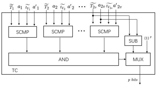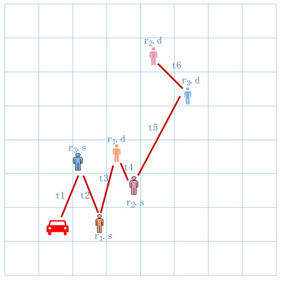 Figure 3. A pratical path of the rider combination.For each path, the RS compares each point with its deadline time. Suppose are p-bit integers. Then the RS randomly chooses -bit length integers () and applies the following operations:The RS first packs and in (15), (16) and then adds the encrypted integers to each item of in (17) and obtains , which is the packing ciphertexts after blinding operation. Similarly, for the deadline time of each point , the RS generates random integers and executes the same blinding operations in (15)–(17).Then the RS sends and to the CS, and they jointly finish the judging for each path. On receiving and , the CS decrypts the ciphertext and unpacks the data. For each path , the RS holds and ; the CS holds and ; and they execute the garbled circuit as shown in Figure 4, in which the SCMP circuit is shown in Figure 5. CMP, MUX, SUB, and MIN denote a comparator circuit, a multiplexer circuit, a subtractor circuit, and a minimum circuit, respectively. We present the details of the circuit in Algorithm 3. The circuit first restores the real values from blind values (1) and then compares the arriving time and the deadline time for each point (2–8). Only if all deadlines are satisfied will the circuit output the total time consumption of the ride-sharing process (9–10), or the circuit outputs a big enough integer (12).