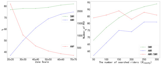 SMR, AMR, and ANP under different zone scales when the number of searched riders is 100 (left) and SMR, AMR, and AMR/SMR under different sizes of when the zone scale is 50 × 50 (right).