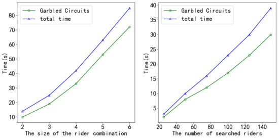 As shown in Table 2, for the rider, the communication cost is always 0.51 KB, and the computation cost is 26 ms. For a driver with no onboard rider, the communication cost is 0.13 KB. For a driver with onboard riders, the submitted information should also contain the requests of riders onboard. As for the server (includes both the ride-sharing server and the crypto server), the communication cost and the computation cost are subject to the size of searched riders. The communication cost of the server is mainly from the packed ciphertexts the RS sends to the CS, and the computation cost mainly contains the cost of ciphertexts packing and computation of the RS, the ciphertexts unpacking of the CS, and the execution time of the garbled circuit. From the table, we can see that the total execution time of the server is about 30 s if the number of riders to be searched is 100. The responding time is acceptable for users with an appropriate searching scale. Moreover, we especially evaluate the computation cost of the garbled circuit with different searched riders and the number of available seats. From Figure 8, we can find the execution time of the garbled circuit takes up most of the total computation cost, and the cost rises faster as the size of and v become bigger.
