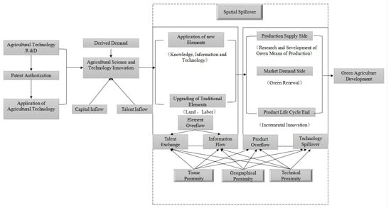 Based on the perspective of spatial spillover, scientific and technological agricultural innovation is an important way to improve the level of agricultural green development. This is because the interregional flow of factors and products will promote the optimal allocation of resources in space, accelerate the dissemination and diffusion of innovative technology, knowledge, experience and information through the spatial spillover effect, strengthen the basic conditions of local innovation activities and promote the local green development of agriculture. Accordingly, in this paper, we divide the spatial spillover path of scientific and technological agricultural innovation on agricultural green development into the factor spillover path and the product spillover path, and we reveal the impact mechanism of scientific and technological agricultural innovation on green agricultural development (Figure 1).