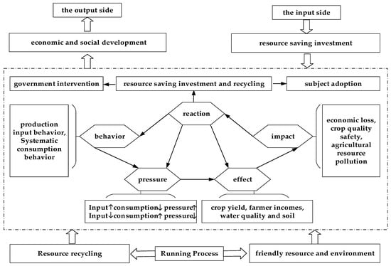Vigorously developing the agricultural circular economy is an effective way to achieve sustainable agricultural development and is a strategic measure to relieve pressure on agricultural resources, protect ecology, use clean resources and promote green agricultural development and sustainable rural economic development. This paper is based on the theory of the agricultural circular economy and comprehensively evaluates the development level of agricultural green development by constructing the BPEIR conceptual model. The BPEIR conceptual model, namely, the “behavior–pressure–effect–impact–response” model (Figure 2), is one of the typical quantitative models of the agricultural circular economy. The model assumes that the green agricultural production system consists of several regional systems and that there is total circulation in the system, whose size is determined by its external input and internal consumption. Specifically, if the use of system resources in a region increases and the consumption decreases, this behavior will increase the pressure on the system, resulting in negative effects. For example, in agricultural production, the abuse of fertilizers and pesticides will reduce the actual effective utilization rate and then lead to a reduction in crop yield and a decline in farmers’ income. The accumulation of negative effects has a strong impact on the system, causing economic and ecological problems, which forces the main body to respond to them and take a series of measures that are conducive to agricultural production to reduce the pressure on the system, such as controlling the total amount of agricultural water use. Additionally, environmentally polluted agricultural water, the reduced use of chemical fertilizers and pesticides, livestock and poultry manure, agricultural film and crop straw are resourced, comprehensively recycled and reused as harmless treatment measures to achieve resource-saving input and resource recycling. On the contrary, if resource usage in a regional system decreases, consumption increases and resource recycling is realized, decreasing the system pressure, which is conducive to benign development. In conclusion, based on the BPEIR conceptual model, this paper comprehensively evaluates the development level of green agriculture by considering the input, process and output of the system.