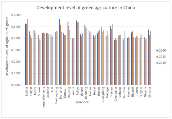 As can be seen from Figure 3, the agricultural green development level of 30 provinces in China was generally stable at 0.35–0.60. The average agricultural green development level of some provinces, such as Beijing and Fujian, is higher than 0.5, indicating a high agricultural green development level. The average value of the agricultural green development level in Shanxi and Chongqing is lower than 0.4, indicating that the development level of agricultural green in Shanxi and Chongqing is low. A possible reason is that Beijing and Fujian have a high level of economic and social development and have advanced crop management concepts, which have a positive role in promoting agricultural green development. However, Shanxi and Chongqing lack agricultural technology promotion and have insufficient agricultural industrialization infrastructure, and capital investment cannot introduce large-scale green development compound talent, which is not conducive to agricultural green development in central and western provinces and cities.
