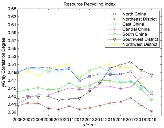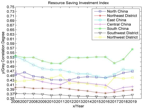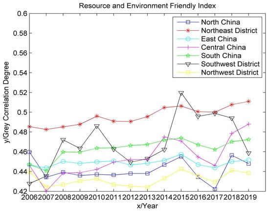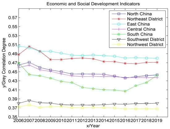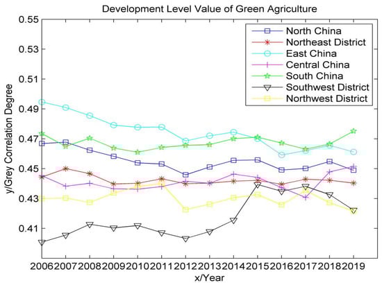 In this study, the gray correlation analysis method was used to calculate the level of agricultural green development in 30 provinces in China based on the data published in the China Statistical Yearbook from 2006 to 2019. Due to limited space, this paper only presents data from 2006, 2013 and 2019, as shown in Figure 3. Secondly, seven geographical regions of China, namely, north China, northeast China, east China, central China, south China, southwest China and northwest China (hereinafter referred to as the seven regions), were selected as the study regions. MATLAB software was used to analyze the temporal variation trend of the agricultural green development level evaluation index in the seven regions (excluding Tibet, Taiwan, Hong Kong and Macao) from four dimensions: economic and social development, resource-saving input, resource recycling and resource and environment friendliness, as shown in Figure 4, Figure 5, Figure 6, Figure 7 and Figure 8.