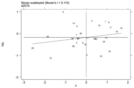 Local spatial autocorrelation is an index to measure the spatial correlation of research objects from a local perspective. In this paper, Moran’s index is used to identify the local spatial pattern characteristics of agricultural science and technology innovation and agricultural green development, which can be divided into four types of agglomeration. The first type is high-value agglomeration (HH), which indicates that the innovation level of agricultural science and technology in the province is high, and that of the neighboring provinces is also high, presenting a high-level mean spatial correlation agglomeration state of “high in the center, high in the surrounding areas”. The second type is low-value collapse (LH), which indicates that the innovation level of agricultural science and technology in the province is low, but the innovation level of agricultural science and technology in the neighboring provinces is high, presenting a spatial disequilibrium correlation agglomeration state of “low in the center, high in the surrounding areas”. The third type is low-value agglomeration (LL), which indicates that the innovation level of agricultural science and technology in this province is low, and that of its neighboring provinces is also low, presenting a low-level mean spatial correlation agglomeration state of “low in the center, low in the surrounding areas”. The fourth type is high-value bulge (HL), which indicates that the agricultural science and technology innovation level of the province is high, but that of the neighboring provinces is low, presenting a spatial disequilibrium correlation agglomeration state of “high in the center, low in the surrounding areas”. The specific calculation formula of the local Moran’s index is as follows: