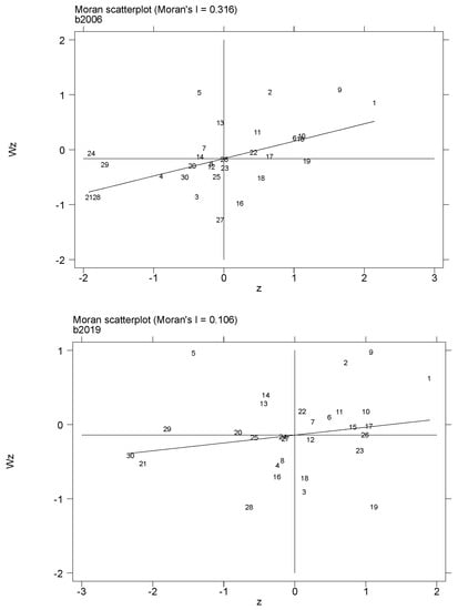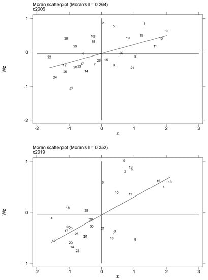 Moran scatter plot of agricultural technology application in 2006 and 2019.
