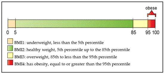 As shown in Figure 1, this research divides the student respondent samples into four parts (BMI 1, BMI 2, BMI 3, and BMI 4) using the BMI Percentile Calculator of the Centers for Disease Control and Prevention []. BMI 1 represents underweight adolescents, with a BMI% < 5th percentile, and BMI 2 is characterized as a healthy weight: 5th percentile ≤ BMI% < 85th percentile. BMI 3 represents an overweight group: 85th percentile ≤ BMI% < 95th percentile. The BMI 4 group is considered obese, with a BMI% ≥ 95th percentile.