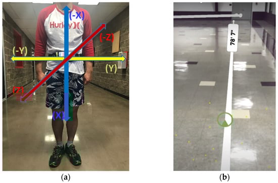 X-Y, and Z-axis orientations of the smartphone during the walking balance test. X-axis is the right (−) and the left (+) side of the participant. Y-axis is the upward (−) and the downward (+) of the participant. Z-axis is the forward (+) and the backward (−) of the participant. The participants wearing the smartphone with the mHealth application walk about a total of 157 feet. (a) A participant wearing a smartphone; (b) Indoor physical education (PE) room.