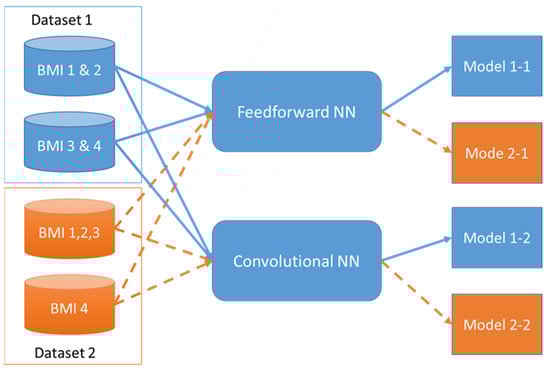Dataset 1 and Dataset 2 in Figure 3 were fed to train the feedforward neural network for creating Model 1-1 and Model 1-2. Again, both datasets were fed to train the convolutional network for creating Model 2-1 and Model 2-2.