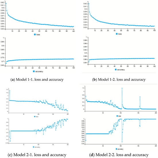 Table 3 and Figure 4 show the losses and accuracies of the four different models: Figure 4a shows the Model 1.1. loss and accuracy; Figure 4b shows the Model 1-2. loss and accuracy; Figure 4c shows the Model 2-1. loss and accuracy; and Figure 4d shows the Model 2-2. loss and accuracy. The accuracy of the models with Dataset 1 is low for predicting the student group with obesity. This is due to the fact that the BMI 3 (overweight) data falls into the obese group. The students in BMI 3 presented similar walking movements to those in BMI 2. Therefore, the models using Dataset 1 distinguished the BMI 2 and BMI 3 groups at a lower rate. The accuracy rates of Model 1-1 presented 61.8% and 54.8% for Model 2-1. The models with Dataset 2 presented higher accuracy when compared to the models with Dataset 1. The students in BMI 4 presented more distinguishable walking movements than the students in the other BMI groups, BMI 1, 2, and 3. Model 1-2. displayed an accuracy of 90.5%, and there was a 79% accuracy for Model 2-2.