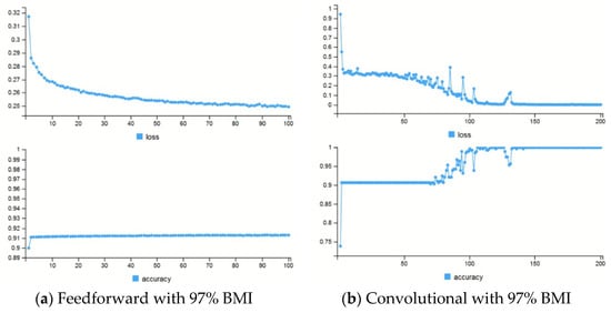 We divided the students in BMI 4 into two parts, one with BMI% < 97th percentile, and the other with BMI% ≥ 97th percentile. No student had an exact BMI % of the 97th percentile. A total of 17 students among 25 students in BMI 4 were over a BMI % of the 97th percentile. Among the 17 students with a BMI% > 97th percentile, 10 students were used to train the feedforward and convolutional neural networks, and 7 students were used for testing the neural networks. The students with a BMI % < 97th percentile, as well as those in BMI 1, 2, and 3, were merged and labeled "0". The students with a BMI % ≥ 97th percentile was labeled “1”. The feedforward and convolutional neural networks were trained with the new dataset coded in “0” and “1”. The feedforward and convolutional neural networks with the new dataset show the highest rate of accuracy among all the tested models. The accuracy of feedforward neural networks using the new dataset is 92.6%, as displayed in Figure 5a. As is shown in Figure 5b, the accuracy of convolutional neural networks using the new dataset is 87.1%.