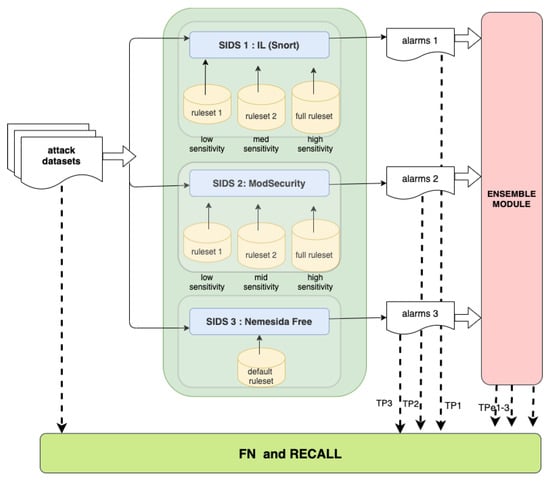 Figure 2 illustrates the experiment carried out to ascertain the Recall/Detection Rate of the systems and configurations shown in Table 1. The alarms generated by each system have been analyzed both individually (for SIDS comparison) and combined with an ensemble module that performs three different decisions: union (i.e., at least one SIDS detects attack), intersection (i.e., all SIDS detect attack) and voting majority (at least two SIDS detect attack). Since each register in the attack datasets represents an attack instance, those registers that do not trigger an alarm will be considered as False Negative (FN). Therefore, the recall metric can be calculated and used to evaluate the detection capability of the systems under study. The cooperative decision made by the ensemble module will also let us figure out whether an ensemble decision improves the detection performance.