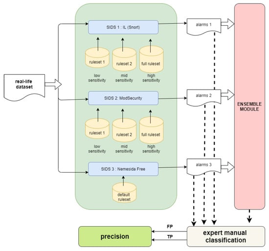 Figure 3 illustrates our second experiment. Note that only a very small portion of the +14 M registers will be classified as attack. As such, the only viable option is to manually check the classification of the alarms generated as TP or FP rather than inspecting millions of http requests to determine TN and FN. Thus, we use the precision metric and alarm generation rate to evaluate the SIDS under study. Like in the previous experiment, the results will be analyzed individually (by SIDS) and cooperatively (i.e., mixed with an ensemble module similar to the previous experiment).