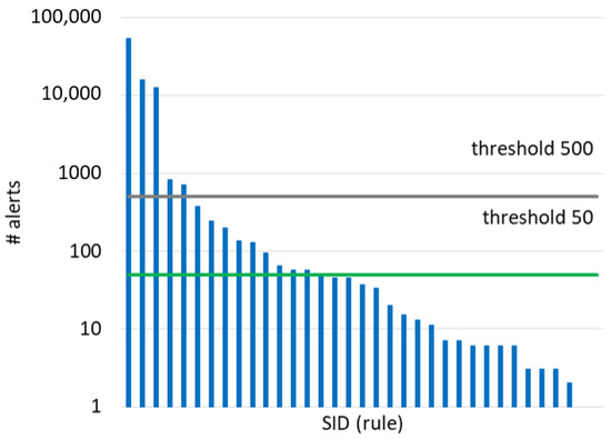 The first step in our procedure is to run InspectoLog with this initial ruleset, keeping track of the Signature ID (SID) and URI in each alarm. This lets us build a histogram of rules (SID) sorted from larger to smaller by the frequency of the alarms generated such as the one shown in Figure 4. In our case, only 35 out of 3198 rules produced alarms, the top 10 are listed in Table 7. Observe that the top 5 rules generated more than 500 alarms each, or that the top 14 rules generated at least 50 alarms each (see thresholds in Figure 4).