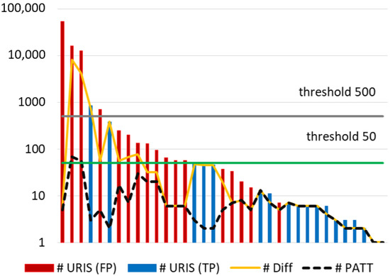 - After the manual classification of the URIs/patterns triggered by the rule, the precision is calculated (). If the rule does not reach the target precision, , it should be deactivated. Otherwise, the rule is included in the final ruleset, and the number of TP is updated to calculate the overall precision of the active ruleset ().