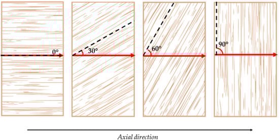 The density parameter as a focus of this work was defined as the ratio between the dry weight of wood divided by the green volume of the same wood (expressed in g/cm3) [4]. In addition, the tree ring width (TRW) was investigated, as one of the main parameters used in dendrochronology for the reconstruction of climate variability of the past (tree rings usually grow wider in warm, wet years and they are thinner in years when it is cold and dry). Finally, the wood grain angle as the angle between the wood fibre direction and the vector in the axial direction (as shown in Figure 1), was studied together with the density as influencing factors in the AE detection.