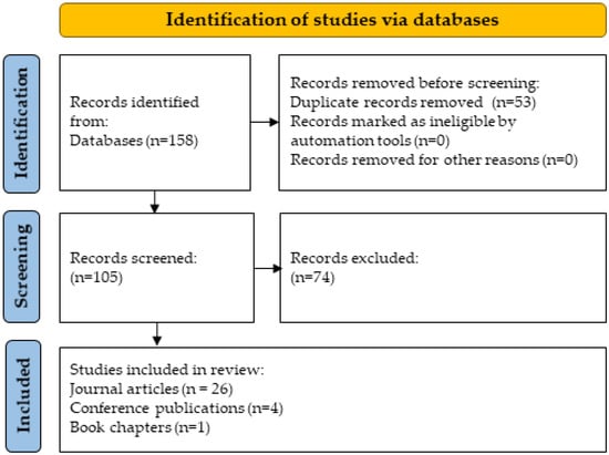 In step (iii), a list of 31 papers were included in the review, among them 26 articles in peer reviewed journals, 4 conference papers and 1 book chapter.