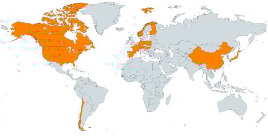 Geographic distribution of the first author’s affiliation involved in the research topic. Created with “MapChart” (Credit: https://mapchart.net/, accessed on 30 July 2021).