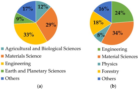The expertise and cultural background of both the first and last authors of each document were investigated and results are shown in Figure 5a. The authors are mainly involved in Engineering studies (33%), then in Material Sciences studies (29%), then in Agricultural and Biological Sciences (12%), in Earth and Planetary Sciences (9%) and in other disciplines including Chemistry, Computer Science, Art and Humanities, Physics and Astronomy, Energy and Environmental Science. Figure 5b shows a pie chart reporting the percentage of subject areas of the journals in which this type of research was published. The main macro-areas are Material Sciences (34%), Engineering (24%), Forestry (18%), Physics (8%) and other disciplines including Waste Management and Disposal, Agronomy and Crop Sciences, Biotechnology, Nanoscience and Nanotechnology, Plant Sciences and Metals and Alloys.
