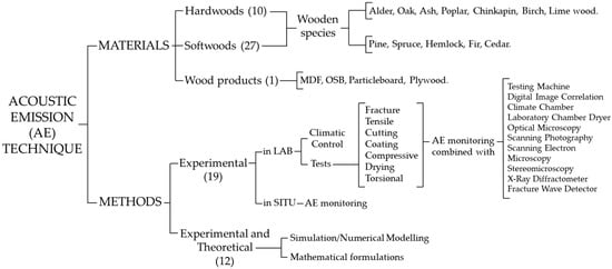 Figure 6 reports a scheme that summarises the main information extracted by the selected reviewed documents. As a result, 27 over 31 documents explored softwoods behaviour, especially of pine, spruce, hemlock, fir and cedar; 10 of them also explored the behaviour of hardwoods such as alder, oak, ash, poplar, chinkapin, birch and lime wood; while one document considered wood products such as medium-density fibreboard (MDF), oriented strand board (OSB), plywood and particleboard. In most cases, the AE technique appeared to be used in laboratory experiments and in only one case among the reviewed documents, it was applied for an in-situ monitoring focused on movable objects only [11]. The tests conducted on the samples were of various type (mainly fracture tests, but also tensile, cutting, coating, compressive, drying and torsional tests) and they sometimes involved an acclimatisation process (e.g., climate chamber [12,13,14] and laboratory chamber dryer [15]).