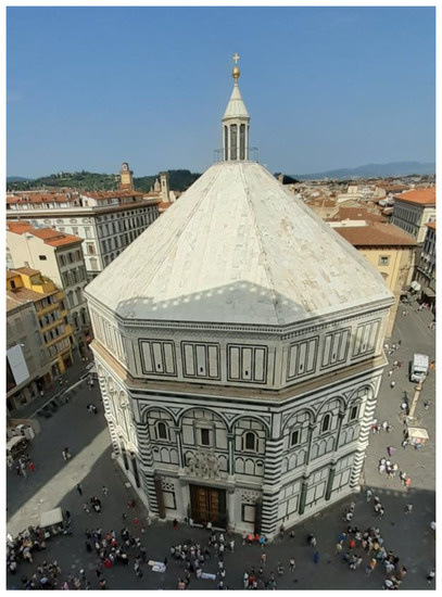The baptistery of Florence (Figure 1) is part of the great monumental complex of Santa Maria del Fiore which comprehends the namesake cathedral, the baptistery, and the Giotto Bell Tower; it stands between Piazza del Duomo and Piazza di San Giovanni, in the historic centre of Florence which has been a UNESCO World Heritage Site since 1982. A special, almost magical, relationship exists between the baptistery and the Florentine people; it was intended for the liturgical function of baptism, a rite which large crowds attended, but following several authors e.g., [4] in the 10-11th centuries it acted also as Florence’s cathedral. Numerous personalities such as the poet Dante Alighieri and members of the Medici family were baptized in this baptistery. The age of the baptistery is still so debated and controversial that Toker [5] defined it as “among the most enigmatic buildings in Europe”; it is an early Christian or a medieval building? did the monument originate as a pagan temple or as a church? In the opinion of the architect Piero Degli Innocenti [6], who has spent a long time studying the matter, the present baptistery was built as a memorial to the defeat, in A.D. 406, of Radagaiso, a Gothic king who had invaded Roman Italy, by Stilicho, a military commander in the Roman army; later (1059), the building was consecrated to Christian worship by Pope Nicholas II [4,7].