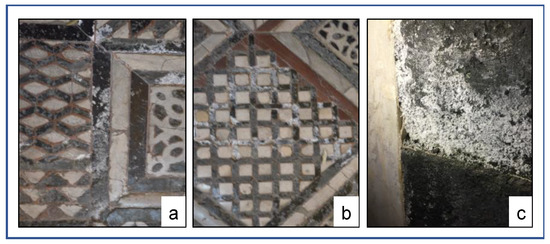 The baptistery pavement, although numerous restorations, interventions and replacements of inlays have been made over the years, displays many forms of decay; the different stone inlays are characterised by discolourations, fractures, loss of material, differential erosion, lacunae (e.g., Figure 4).
